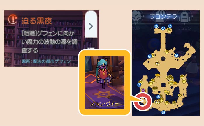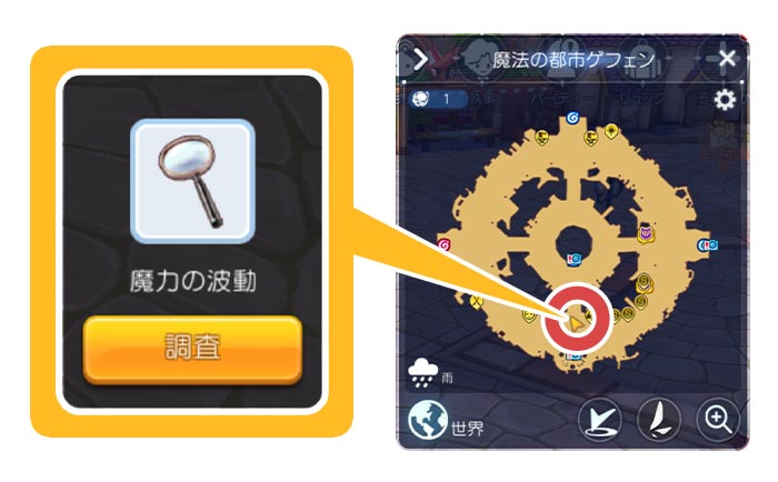 その場合はアプリの再起動をお試しください。それでも表示されない場合は「魔法の都市ゲフェン」南部の噴水前に行くと出現する「調査」ボタンをタップすることでクエストを進行できます。 ![]()