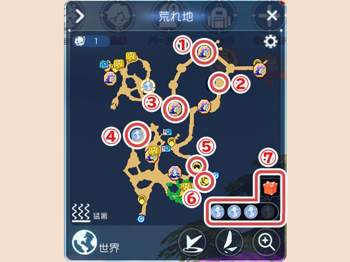 | ③幻域の門/記憶の星枝 幻域の門/記憶の星枝を開放すると、ミニマップでアイコンをタップすると瞬時に該当の幻域の門/記憶の星枝の場所に移動できます。 |