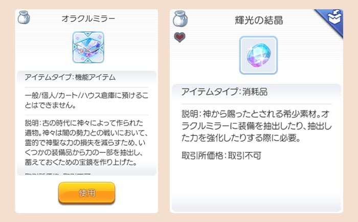 「オラクルミラー」で抽出するには「輝光の結晶」が必要です。 「輝光の結晶」は以下の方法で入手できます。