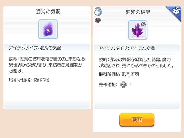 「紅葉の彼岸」と「氷雪地帯」では「混沌の気配」と「混沌の結晶」が手に入ります。