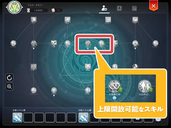 など対象のスキルはアイコンの右下に表示される↑をタップすると上限開放ができます。