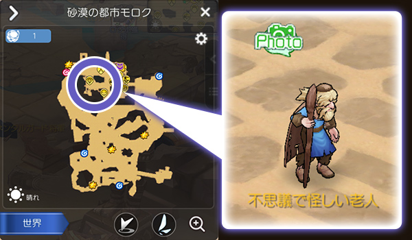 カメラを構えた時に表示される名所マーカーを参考にしてモロク内を調べよう!名所を撮影すると冒険経験値を獲得できます。