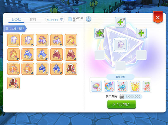 魔力注入のラインナップに肩にかける物と靴が追加されます。さらに、忍者とコラボ職業用装備と、鎧の対象アイテムに「シルクローブ」が追加されます。
