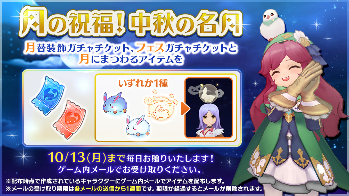 中秋の名月のシーズンにちなんで、「月替装飾ガチャチケット」「フェスガチャチケット」に加え、"月"にまつまわるアイテムを毎日プレゼント!