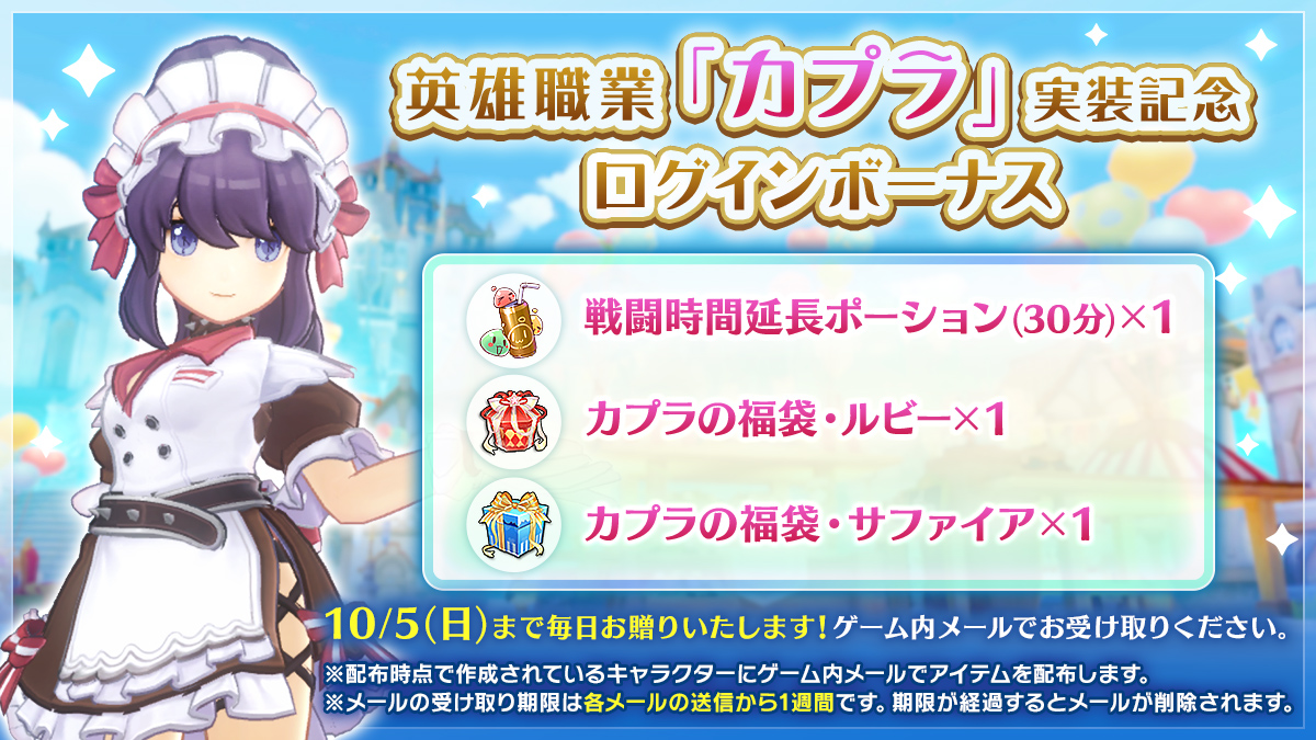英雄職業「カプラ」の実装を記念してカプラサービスからプレゼント!期間中、日替わりアイテムをゲーム内メールでお贈りいたします!
