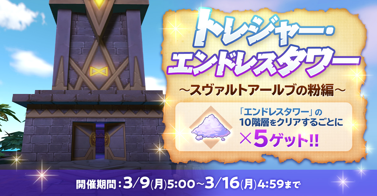 期間中毎週、エンドレスタワーの10階毎の難易度を初回クリア時に「スヴァルトアールブの粉」×5を獲得できます。