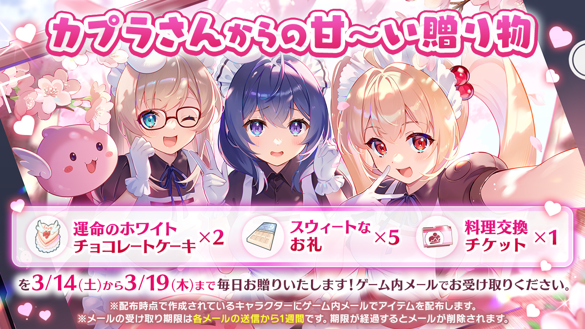 ホワイトデーにちなんで、カプラから日頃の感謝の気持ちを込めたアイテムを期間中毎日、ゲーム内メールでお贈りいたします!