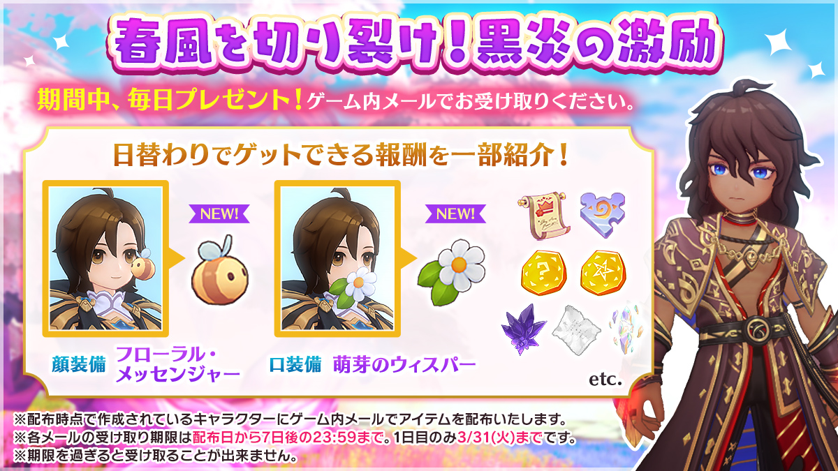 期間中は毎日日替わりアイテムをゲーム内メールでお贈りいたしますのでぜひお受け取りください。