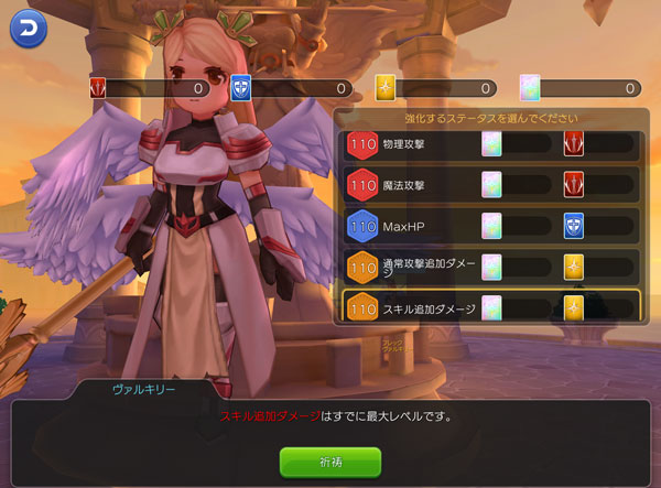 ギルド領地のヴァルキリーで行える【聖なる祝福】の「物理攻撃/魔法攻撃/MaxHP/通常攻撃追加ダメージ/スキル追加ダメージ」の強化段階の上限を100から110にアップいたします。
