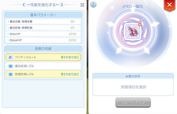 「サクライのメモリー・パープル」の3つ目の効果オプションの「突破」ができるようになります。「サクライのメモリー・パープル」がレベル40に到達すると、メモリー強化画面で「突破」を行うことができます。「突破可能」と表示されている効果オプションに実行できます。